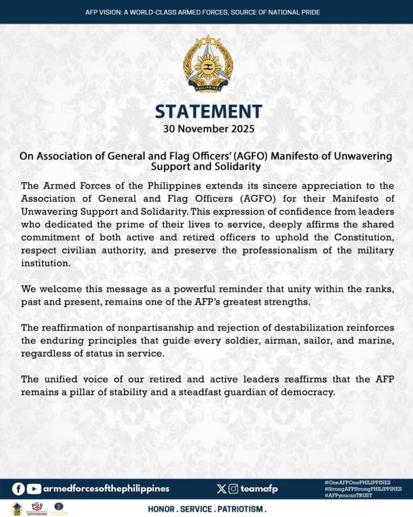 “The unified voice of our retired and active leaders reaffirms that the AFP remains a pillar of stability and a steadfast guardian of democracy,” the military said.