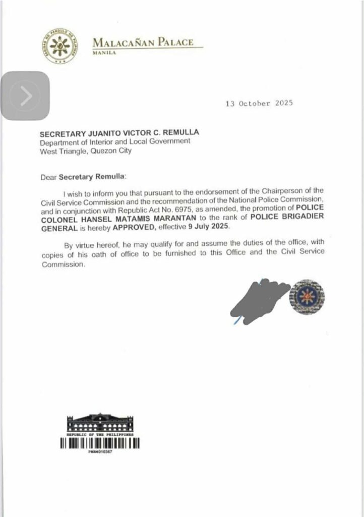On October 13, a message from Malacañang quietly made its way to the office of Interior Secretary Juanito Victor Remulla, a communiqué that would change the course of one man’s story. It bore the long-awaited news: Police Colonel Hansel M. Marantan, once confined within the walls of a custodial cell, had been promoted to the rank of Police Brigadier General.