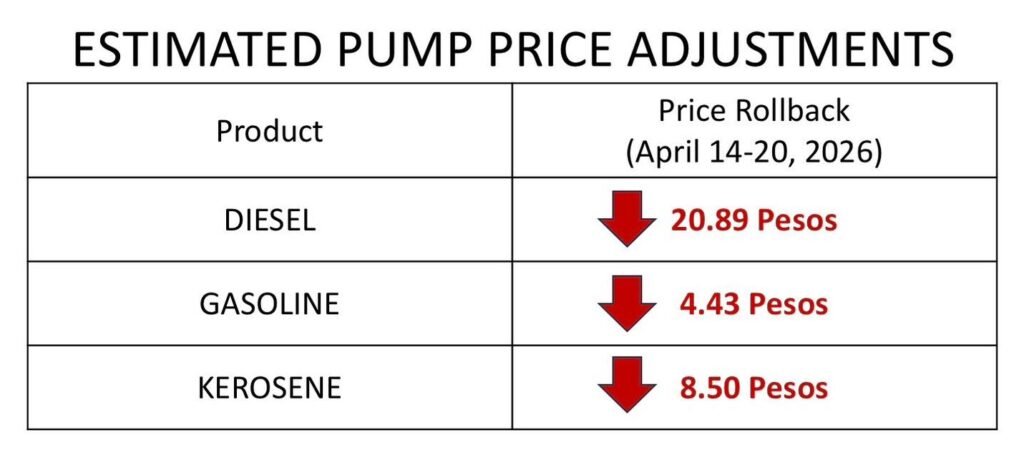 The Department of Energy (DOE) announced an expected “big-time” rollback in fuel prices starting Tuesday, April 14, with diesel projected to drop by P20.89 per liter, gasoline by P4.43, and kerosene by P8.50.