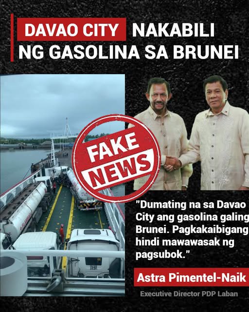 The City Information Office dismissed the posts as baseless, saying no discussions or agreements exist between the city and Brunei for any oil supply. The rumor, widely shared on social media, alleged a “treaty” that would see the oil-rich sultanate deliver fuel directly to Davao, even circulating a photo of a supposed tanker docking in the city.