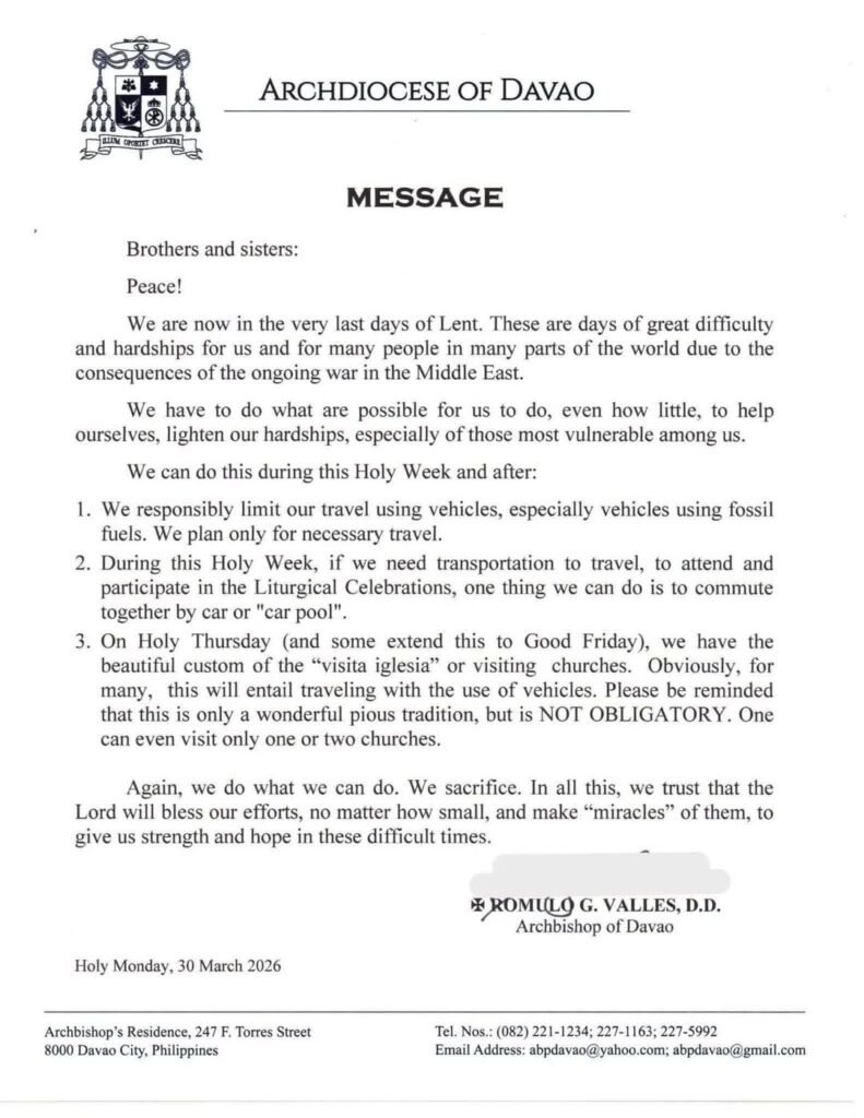 DAVAO CITY  (April 3) — The Holy Week appeal of Romulo G. Valles for Catholics to “limit travel” and embrace small sacrifices underscores a growing reality: even religious traditions are being reshaped by economic pressure.