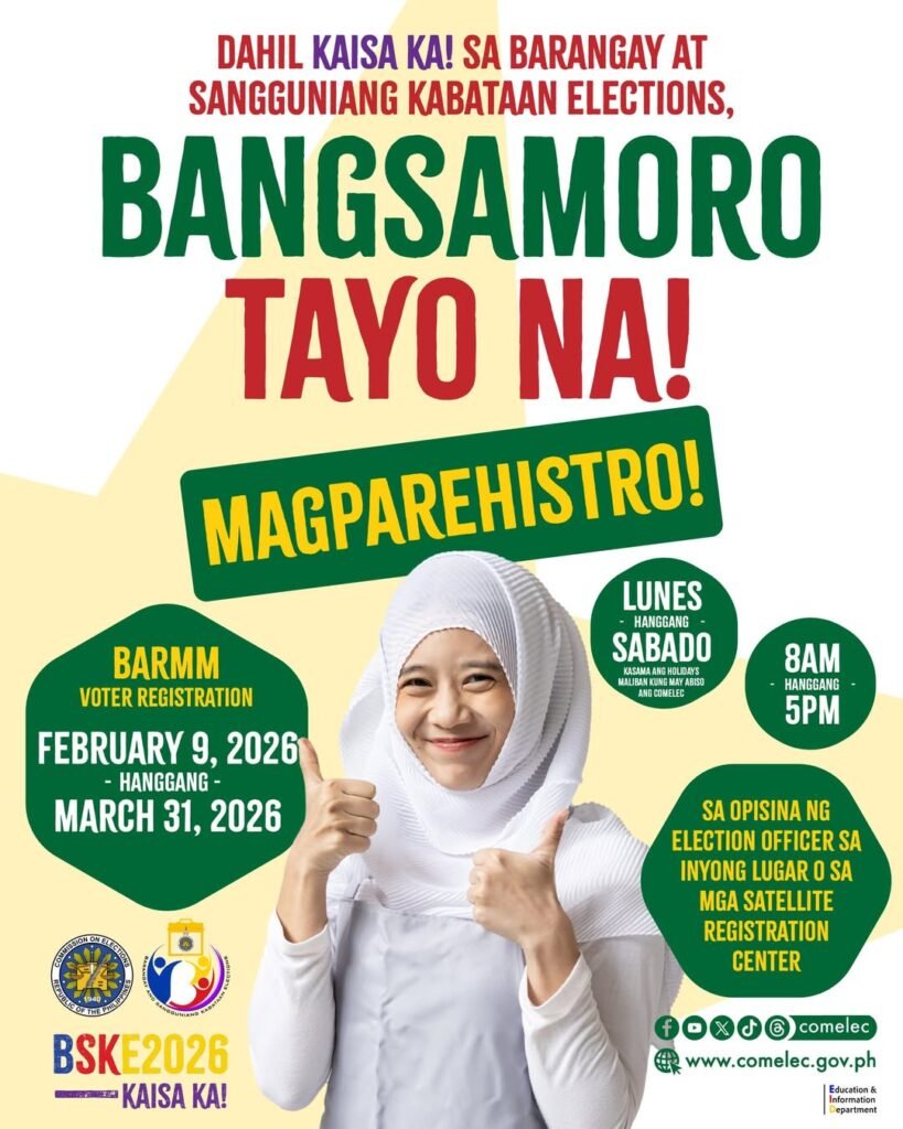 The deadline carries double weight. Those who make it in will be eligible to vote not only in the September 2026 Bangsamoro Parliamentary Elections but also in the November 2026 Barangay and Sangguniang Kabataan polls.