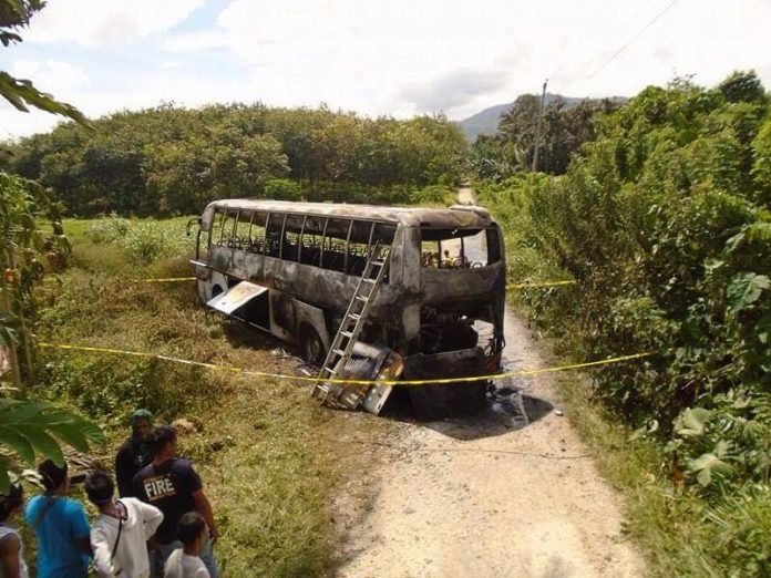 DAVAO CITY, Philippines (March 13)- Members of the communist New People’s Army (NPA) burn a bus plying the Tacurong-Davao route on Monday, March 13 in Sitio Bagong Silang, Makilala, North Cotabato.