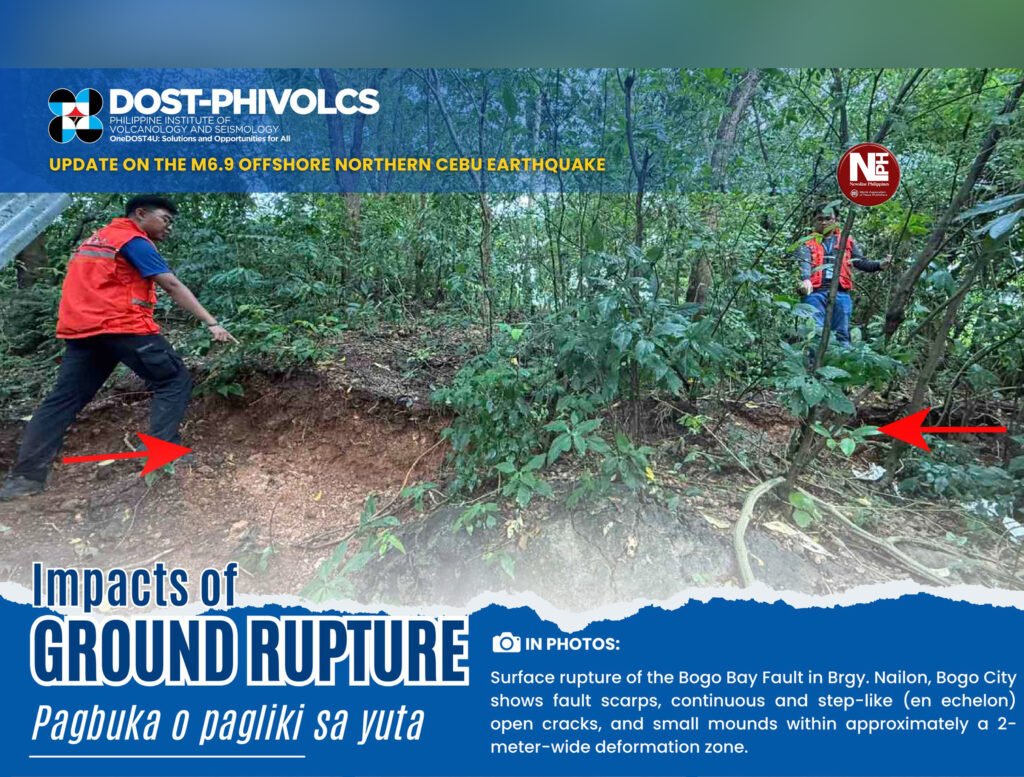 In Sitio Looc, Barangay Nailon, Bogo City, the Phivolcs team found fault scarps, cracks, and pressure mounds within a 2-meter-wide deformation zone. Initial mapping showed around 200 meters of surface rupture, while drone surveys indicate the fault may stretch up to 1.5 kilometers with signs of right-lateral movement. Field verification is ongoing.