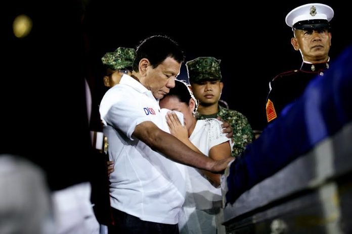 MANILA, Philippines— President Rodrigo Duterte on Sunday led the arrival honors at the Villamor Air Base for the eight soldiers killed in hours-long gun battle between government forces and Maute militants in Marawi last Friday.