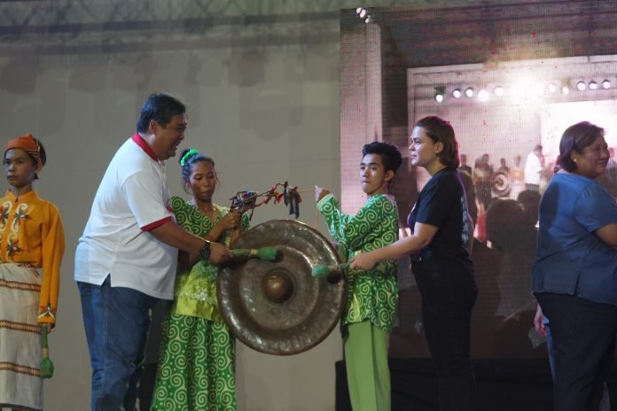 Presidential daughter Davao City Mayor Sara Duterte-Carpio (in black) with Davao Occidental Governor Claude Bautista bang the "agong" to signal the start of the founding anniversary activities.-Photo by: Armando B. Fenequito Jr.